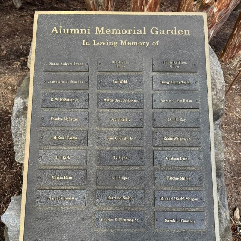 A name plate on a Memorial Stone Structure at the head of the Memorial Garden between Eden Hall and the Ship